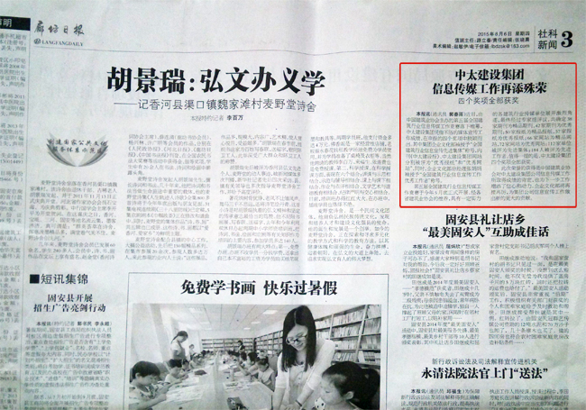 廊坊日報8月6日報道了中太建設集團信息傳媒工作再添殊榮