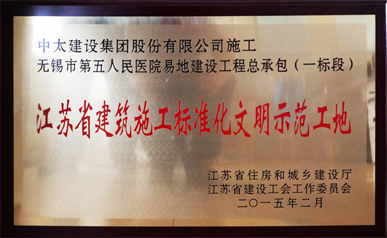 近日,由江蘇省住建廳傳來喜訊,由中太建設集團承建、無錫分公司施工建設的無錫市第五人民醫院易地建設一標段施工總承包工程,榮獲2014年下半年度“江蘇省建筑施工標準化文明示范工地”稱號。