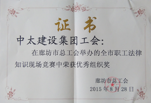 8月28日上午,由廊坊市總工會主辦、中太建設集團承辦的廊坊市職工法律知識競賽在中太大廈二樓報告廳舉行,來自全市各縣市區及經市總工會公開推薦的市直單位共15支代表隊參加了比賽。經過初賽、復賽兩輪激烈角逐,最終香河縣代表隊拔得頭籌,榮獲比賽第一名,中太建設集團工會榮獲“優秀組織獎”。