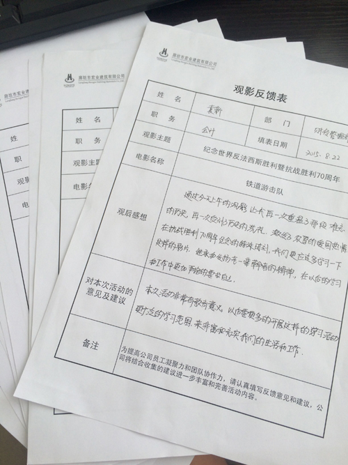 2015年8月22日,為紀念反法西斯戰爭勝利70周年,宏業公司組織全體員工進行了一次革命傳統教育活動,觀看了電影《鐵道游擊隊》,一同回顧了那段血淚鑄成的抗戰史,共同緬懷先烈們的英靈。