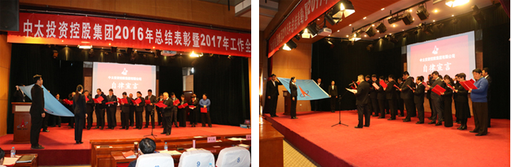 根據會議安排,中太建設集團副董事長燕振義、總裁吳建國作為領誓人,分別引領中太投資控股集團下屬單位董事、監事及中層以上領導干部進行自律宣誓,宣誓人分別在誓詞上簽字,并承諾2017年將恪盡職守、奮發向上,全身心投入到企業發展上來,做合格的企業引領人和決策者。