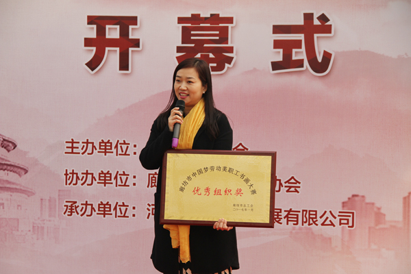 3月16日,“中國夢、勞動美”廊坊市書畫大賽作品展盛大開展,開幕式上,中太建設集團工會被授予活動“優秀組織獎”,集團工會主席張娟娟代表集團工會領獎并接受采訪。同時,集團員工李文成、劉翠蘭書法作品分別獲得優秀獎,并與其他獲獎者作品一道在九天休閑谷展示。