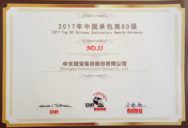 2017ENR/建筑時報“中國承包商80強和工程設計企業60強”榜單日前揭曉,中太建設集團成功入圍“2017年中國承包商80強”榜單,排名第35名,這是中太建設集團第8次入圍該榜單。