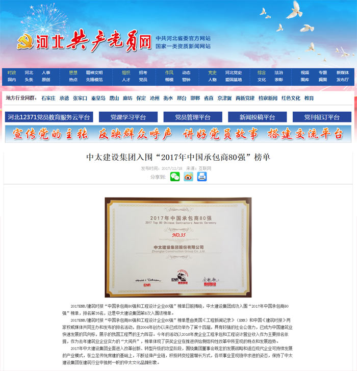 河北共產(chǎn)黨員網(wǎng)報道了“中太建設集團入圍“2017年中國承包商80強”榜單”