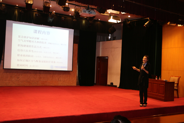 在中國環境健康與衛生安全促進會河北分會的大力支持下,中國安全健康教育中心河北站特邀講師,全民健康咨詢服務部,省健康教育專業委員會委員,宣傳科講師彭一茹走進中太大廈,圍繞CPR現場緊急救護知識;環境污染、室內污染的危害及防護知識;經絡穴位養生;常見職業病的防治;家庭醫療設備的正確區分等內容,從實際案例出發,深入淺出、形象生動的剖析健康的重要性以及穴位養生保健的方法,同時還邀請現場員工代表上臺,與老師合作為現場員工形象的解析了經絡穴位治療的原理及療效。彭一如老師的精彩授課得到了在場員工的一致認可。