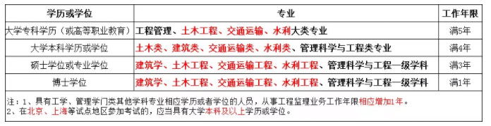 (一)具有工程管理、土木工程、交通運輸、水利大類專業大學專科學歷(或高等職業教育),從事工程監理業務工作滿5年;
