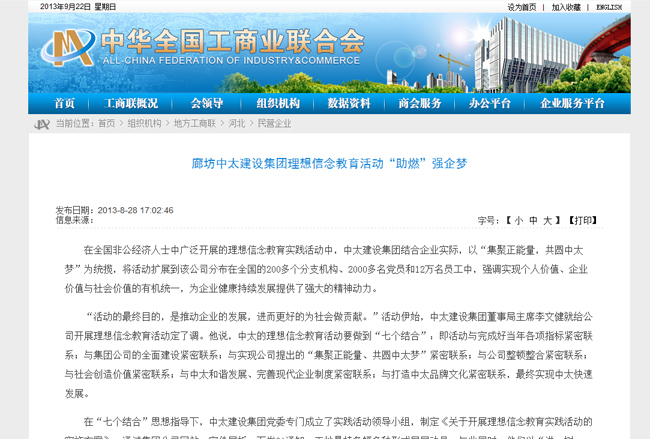 工商聯網站8月28日報道了中太建設集團理想信念教育活動“助燃”強企夢