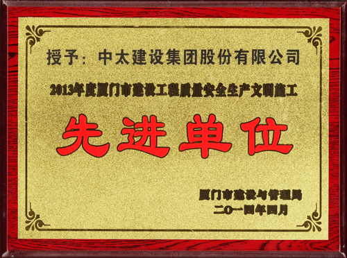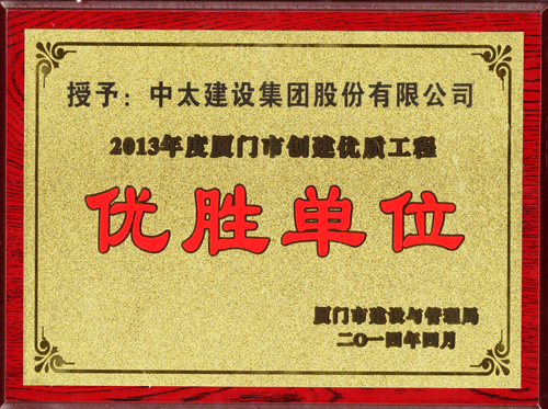 近日,中太建設(shè)集團(tuán)榮獲2013年度“廈門市創(chuàng)建安全文明工地優(yōu)勝單位”、“廈門市建設(shè)工程質(zhì)量安全生產(chǎn)文明施工先進(jìn)單位”、“廈門市創(chuàng)建優(yōu)質(zhì)工程優(yōu)勝單位。何波、曹仰高被評為先進(jìn)個(gè)人。(第九工程局)