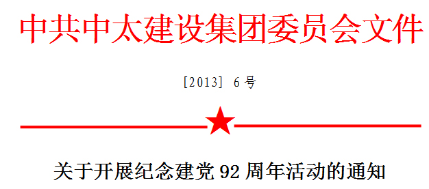 為慶祝中國共產(chǎn)黨建黨92周年,弘揚(yáng)黨的光榮傳統(tǒng)和優(yōu)良作風(fēng),進(jìn)一步調(diào)動和激勵廣大黨員“關(guān)心中太、維護(hù)中太、效力中太”工作的熱情,開創(chuàng)各項工作創(chuàng)新驅(qū)動和科學(xué)發(fā)展的新局面,為完成2013年各項工作任務(wù)和經(jīng)濟(jì)技術(shù)指標(biāo)鼓勁加油,推動集團(tuán)公司又好又快發(fā)展,深入貫徹黨的“十八大”精神和習(xí)近平同志關(guān)于在全黨進(jìn)一步“轉(zhuǎn)變作風(fēng)、端正學(xué)風(fēng)、改進(jìn)文風(fēng)”的要求,結(jié)合集團(tuán)公司實(shí)際,集團(tuán)黨委決定,在“七·一”前后,開展以下系列活動: